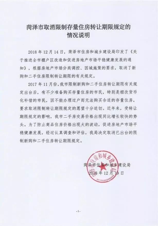 12月19日下午,菏泽市住房和城乡建设局盖章发文,确定取消新购房和二手房转让限制。